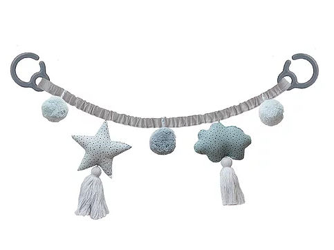 Fin barnvagnskedja från min minietikett. Kedjan är elastisk så det händer ingenting om den lille får tag i den. Det finns ett moln och en stjärna med små prickar på, med skallror inuti. Den är också dekorerad med pompoms. Den kommer i en snygg tygpåse.