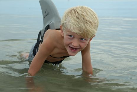 Swimfin är ett patenterat simbälte. Nu kan den lilla simma genom poolen eller vid vattenbrynet, medan bebisen är den söta hajen. Swimfin är gjord för att bäras på ryggen och ger flytkraft utan att hindra barnets rörelse i vattnet. Det är den perfekta simutrustningen när den lille ska lära sig simma. Swimfin är testad för barn i åldern 3-6 år, som väger ca. 15-30 kg. Men det fungerar också bra för både äldre och mindre barn. Här är den i färgen varmgrå.