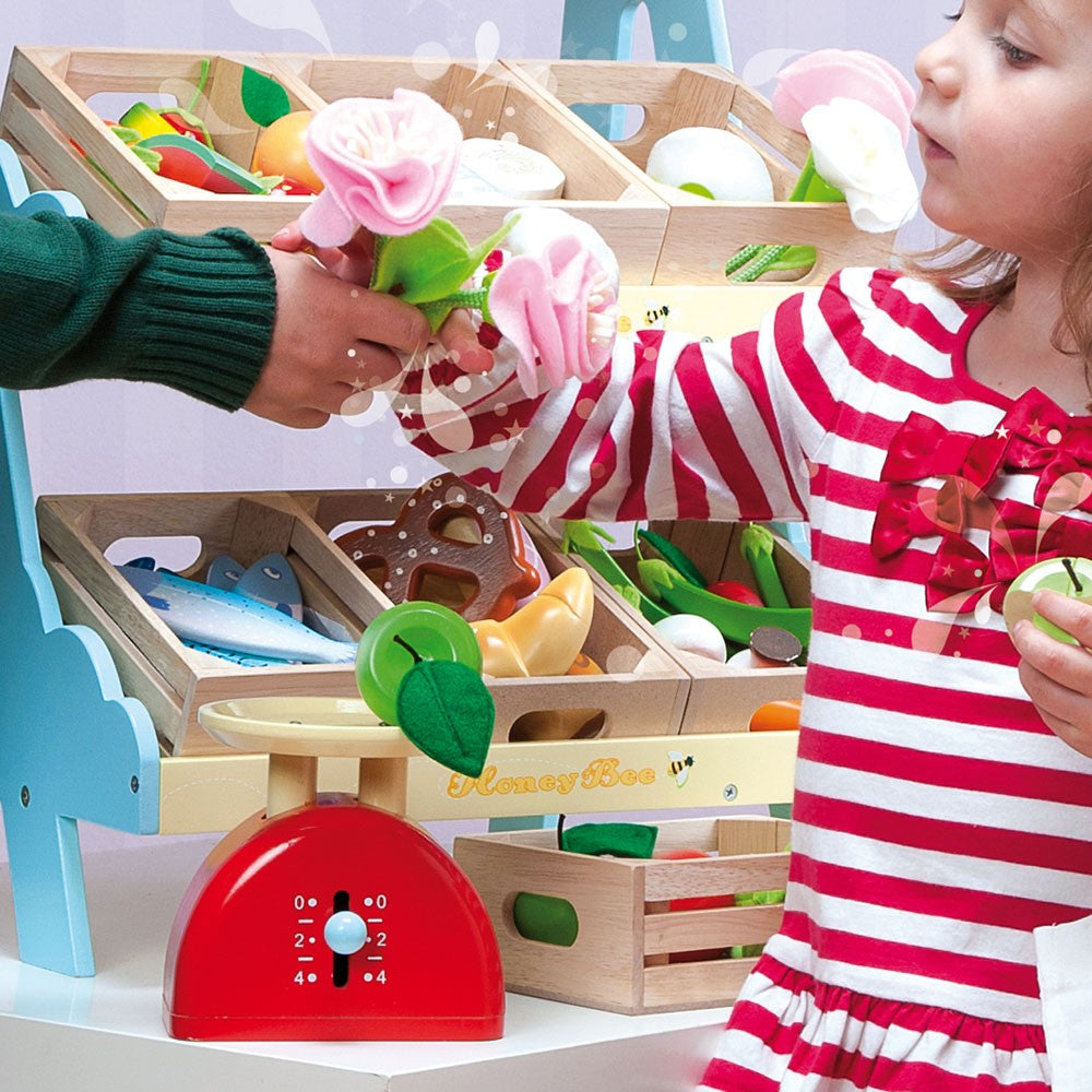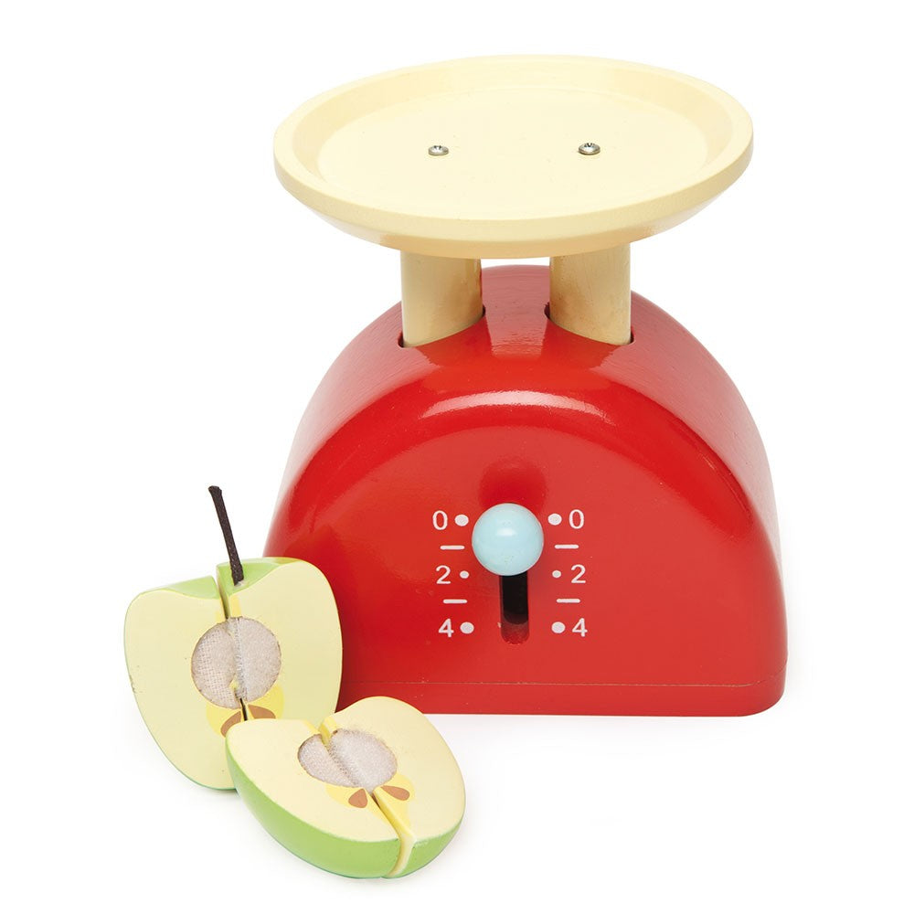Denna härliga köksvåg är från Le Toy Van och passar perfekt in i ditt barns lekkök! Vågen är gjord av trä och målad i vackra ljusa färger. Med vågen följer ett grönt äpple som kan delas i fyra och sättas ihop igen med kardborre.