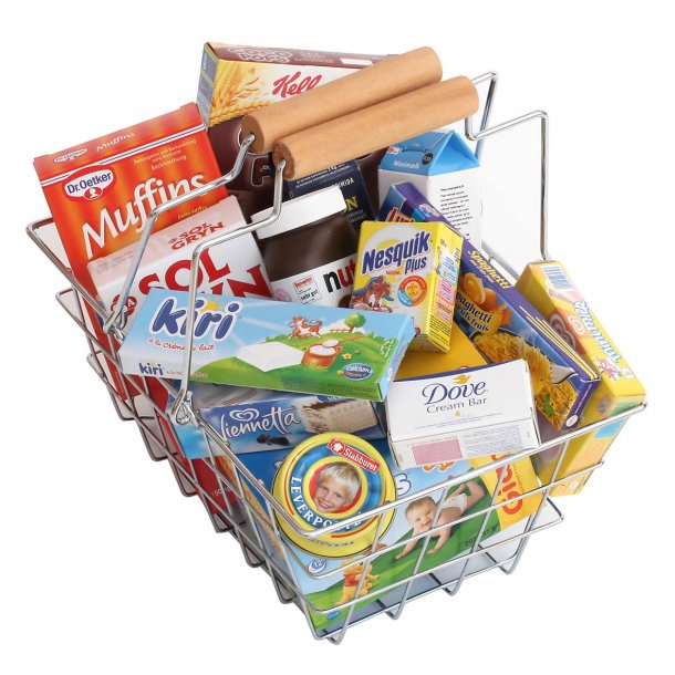 Med denna varukorg får du ett antal tillbehör. Du kan låtsas att du är ute och handlar och sedan komma hem och göra vad du vill.