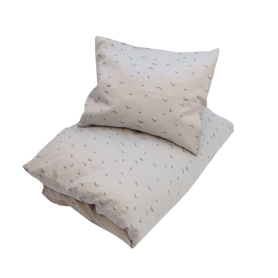 Denna vackra säng passar perfekt in i alla barnrum, då materialet är mjukt och trycket är fint. Sängsetet har ett fint tryck av svarta svalor på den grå bakgrunden.