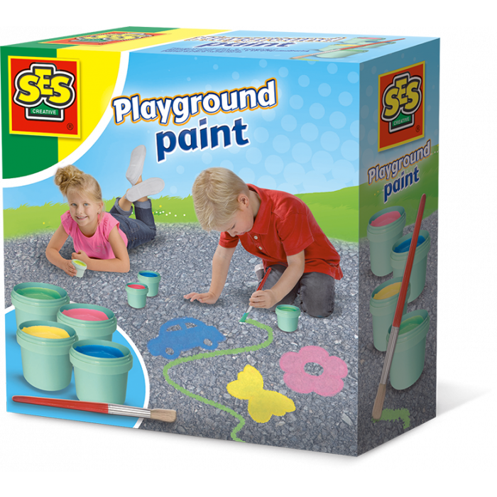 Detta leksaksset från SES -kreative innehåller färg som du kan använda för att måla på kakel och asfalt. Möblera lekplatsen, uppfarten eller trottoaren med pulkaryggar och olika finurliga motiv.