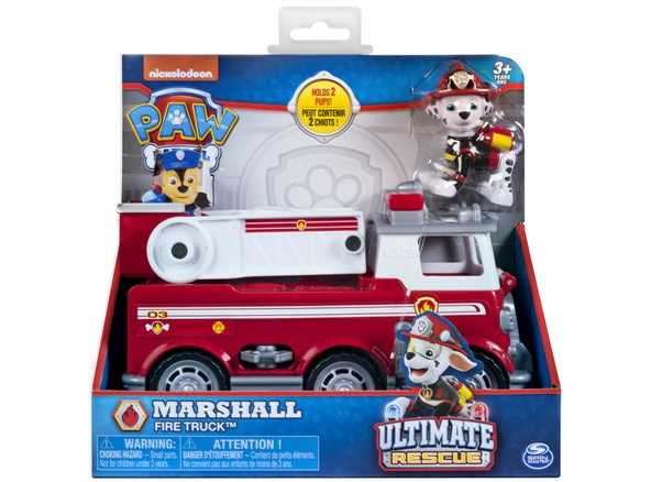 Den välkända valpen från Paw Patrol Marshall med sin stora brandbil, där två valpar kan hjälpa till att rädda staden!