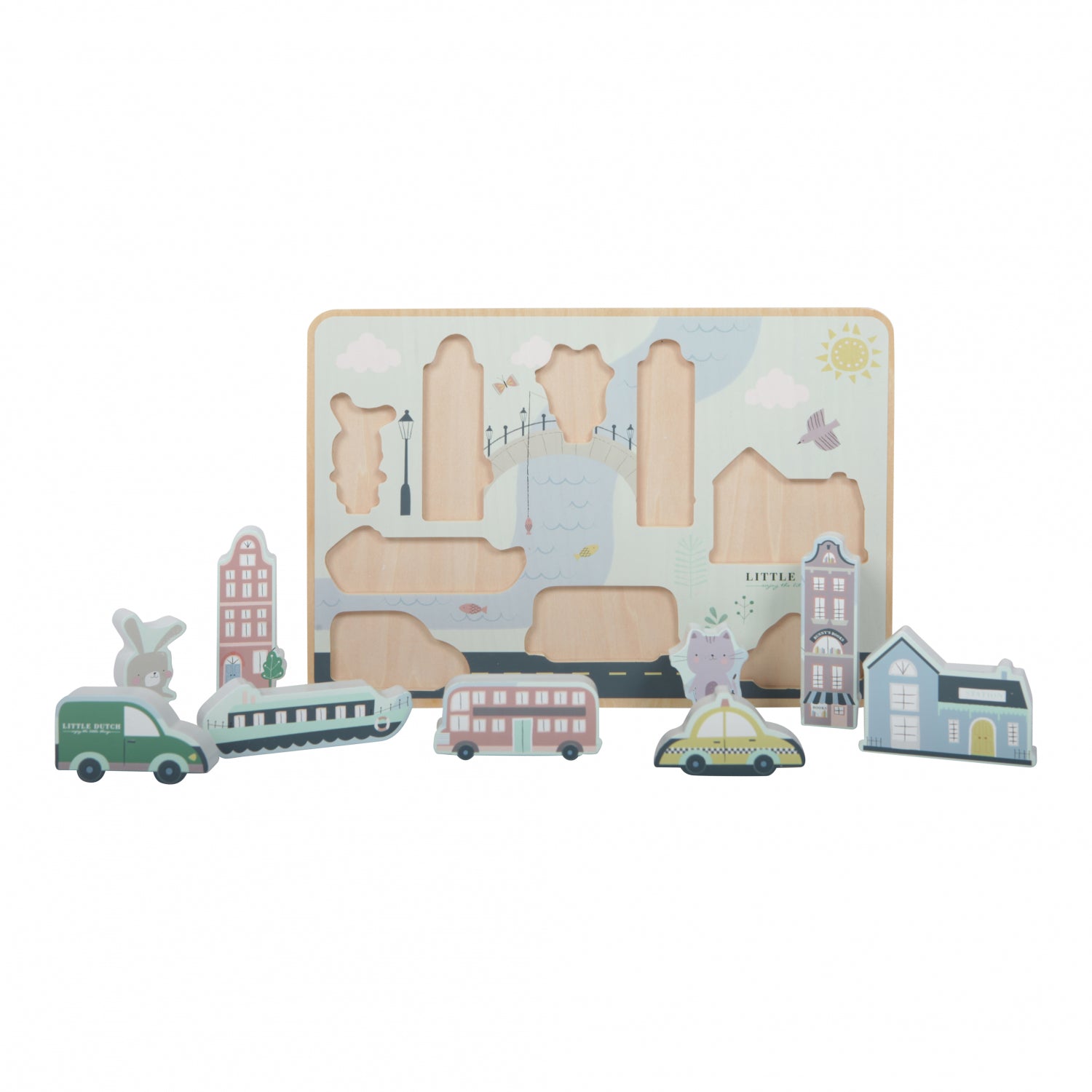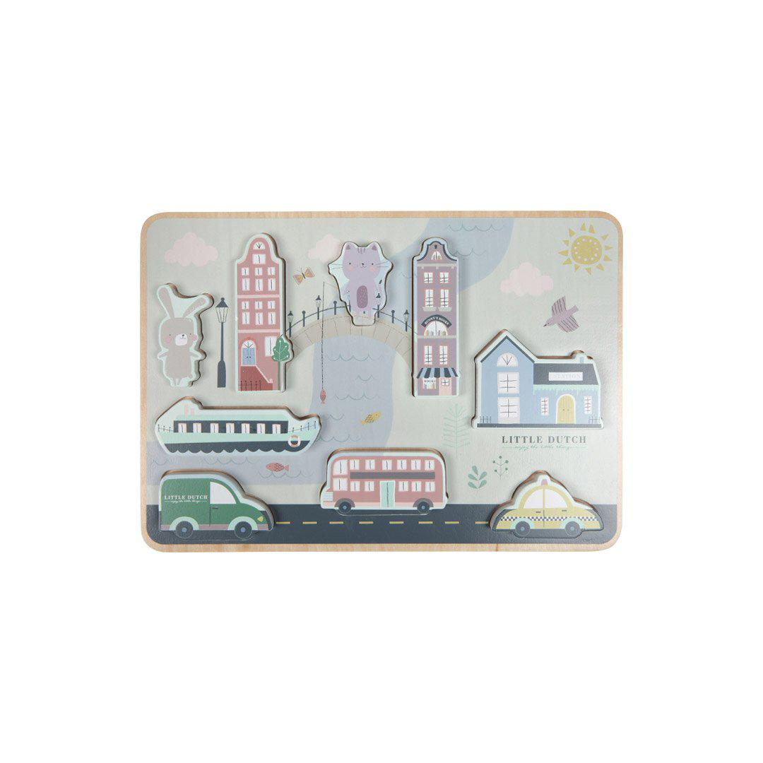 Little Dutch har tagit fram detta fina pussel som utmanar barnet och hans motorik samtidigt som det stimulerar olika sinnen på grund av de olika formerna och färgerna. Pusslet består av 9 bitar med olika motiv, både fordon, byggnader och djur.