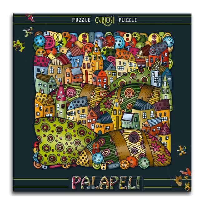 pussel med 210 bitar i roliga former. Samla den färgglada bergsbyn. En liten bricka/ram medföljer så att pusslet kan användas som dekoration hemma.