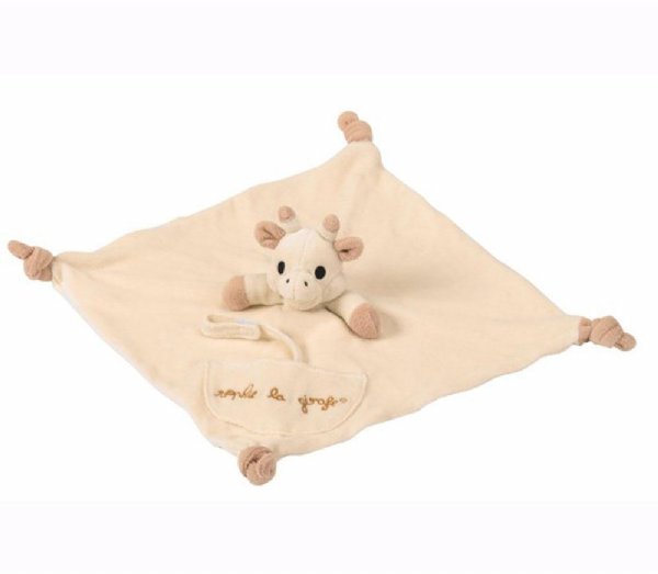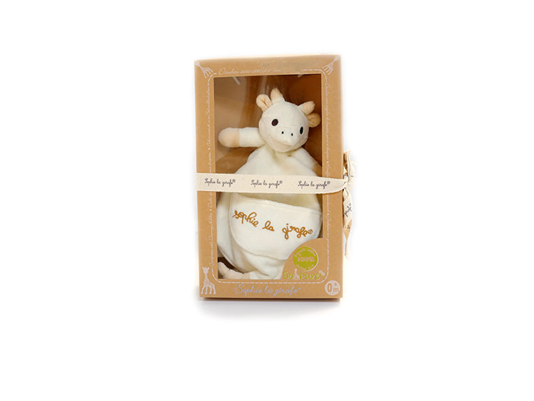 Supersöt och mjuk kram från Sophie La Girafe. Perfekt sovhytt och pojkar för den lilla. Den är gjord av 100% ekologisk bomull.