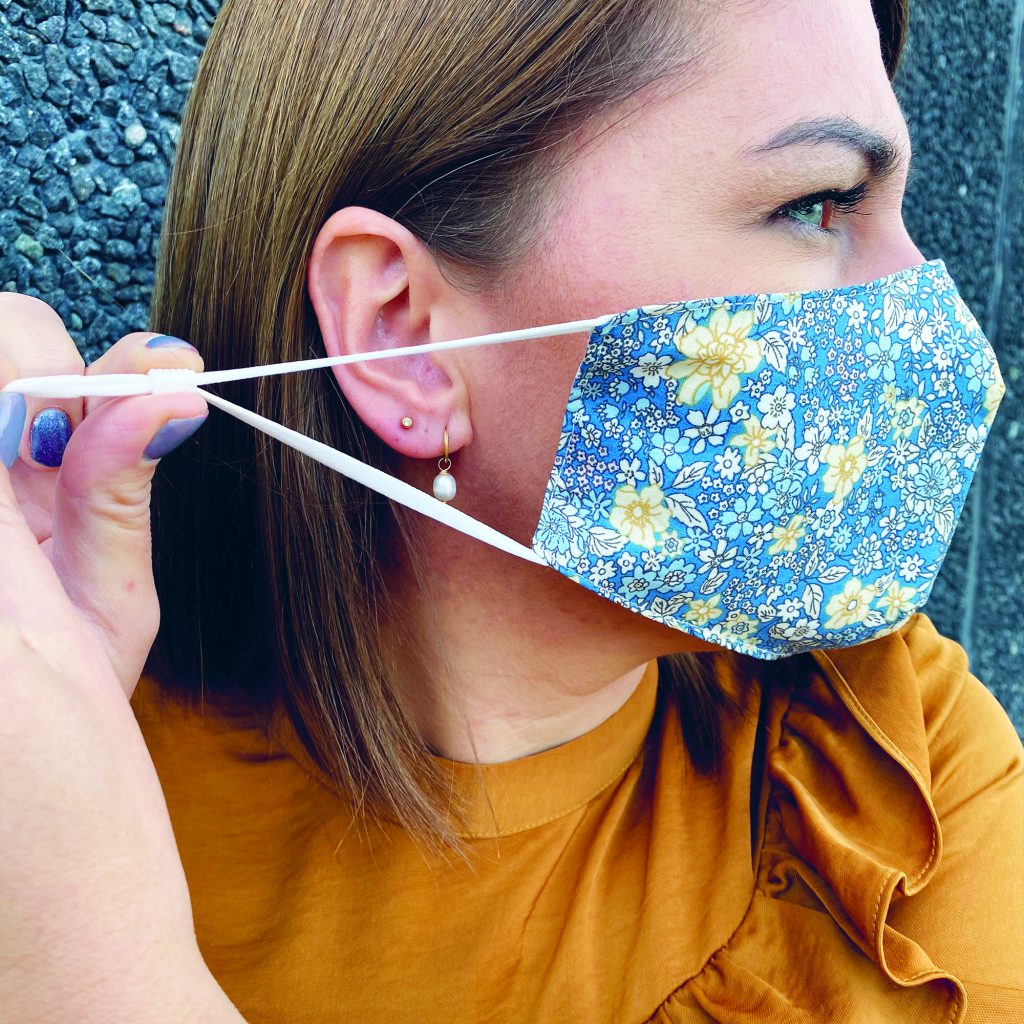Denna härliga munmask i tyg är i ett fint blommönster. Den är gjord av mjuk och andningsbar, tätvävd bomull, så den är skön att sola - även under lång tid.