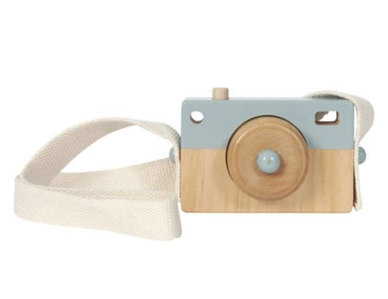Den fina kameran är gjord i trä och här i naturlig färg och blått. Kameran har en vävd rem så den lilla fotografen har kontroll över kameran när han tar bilder.