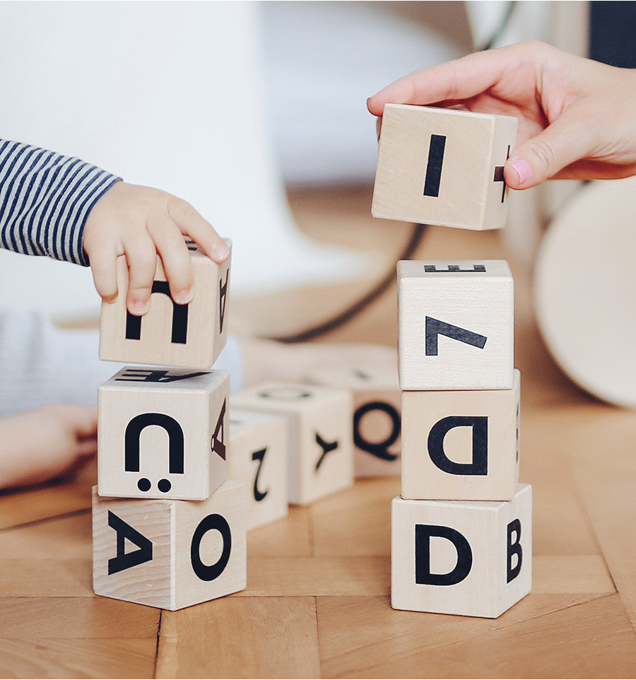 Lär barnet om dessa bokstäver och använd språket för att prata om bokstäverna och finmotorik för att stapla blocket.